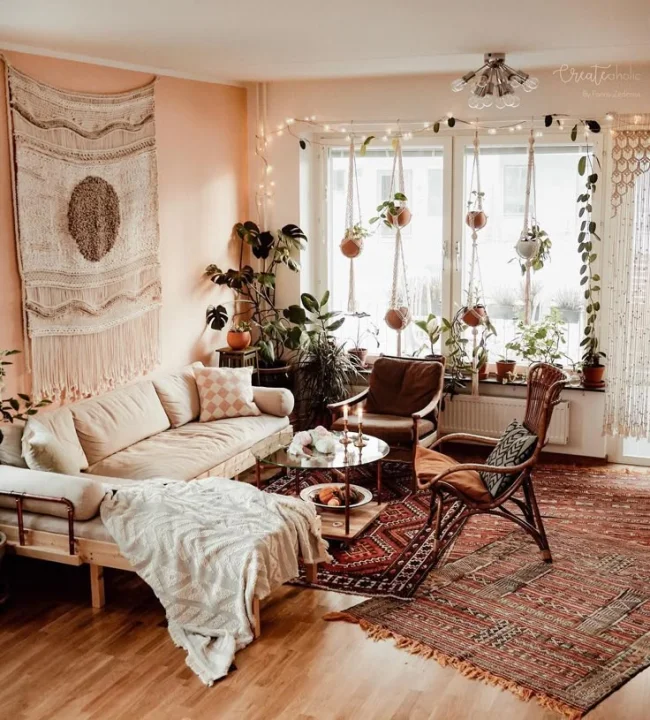 Ahşap, rattan, bambu, keten, pamuk ve hasır gibi doğal malzemeler boho chic’in vazgeçilmezi. El dokuması kilimler, makrome duvar süsleri, seramik vazolar ve el yapımı sepetler mekâna sıcaklık katar.
