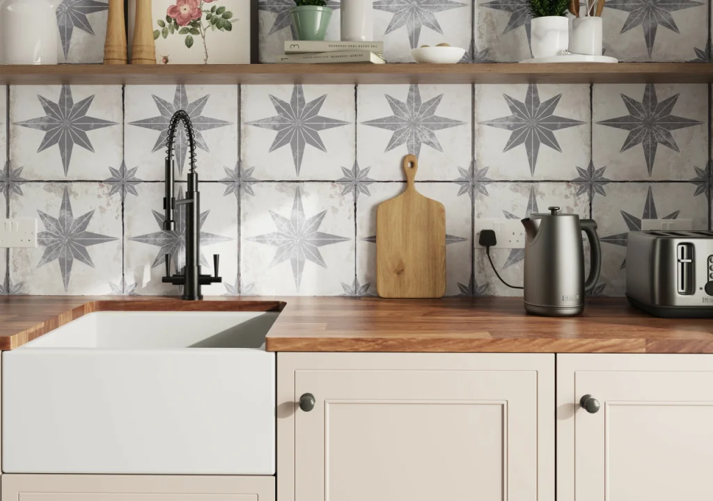- Desenli fayansları düz renk dolaplarla kombinlemek, görsel denge sağlar ve alanın karmaşık görünmesini önler.